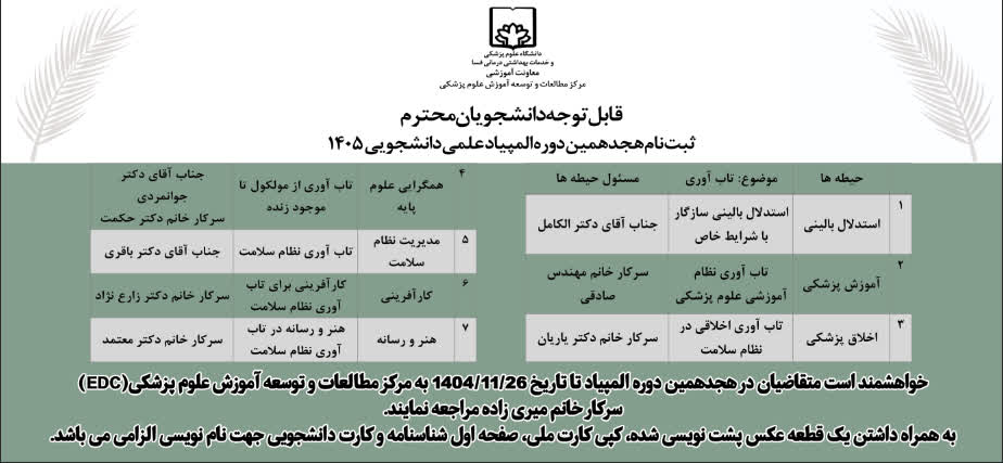 متقاضیان این دوره المپیاد تا تاریخ 26/ 11/ 1404 به مرکز مطالعات و توسعه آموزش علوم پزشکی (EDC) به سرکار خانم میری زاده  مراجعه نماید.
